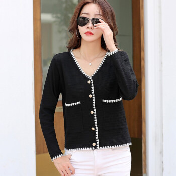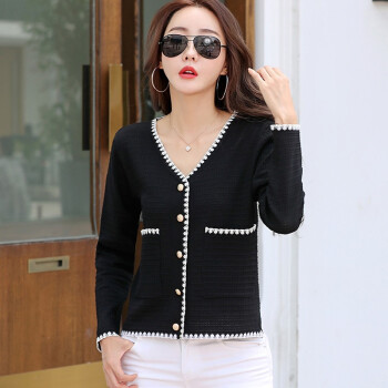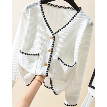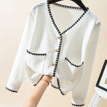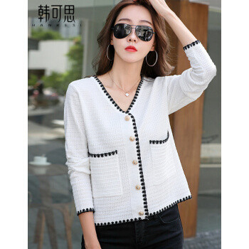 【精选好货】韩可思短外套女2020秋季新款韩版长袖宽松小香风上衣女撞色显瘦白色冰丝针织开衫 白色 请拍正确尺码 |