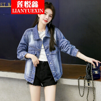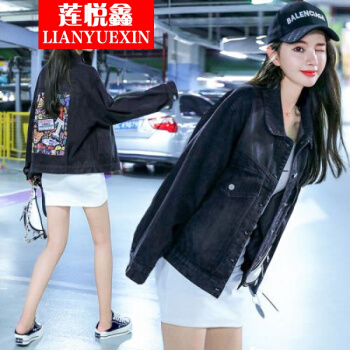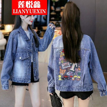 莲悦鑫短外套女大码外套女2020春秋新款韩版宽松印花牛仔外套女百搭网红夹克上衣18631 A蓝色背后涂鸦 S |
