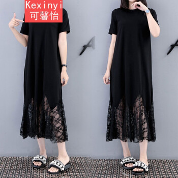 可馨怡 胖妹妹夏装新款蕾丝拼接大码女装胖mm中长款连衣裙宽松遮肚子显瘦鱼尾长裙女 黑色 XXXL(建议150-175斤左右) |