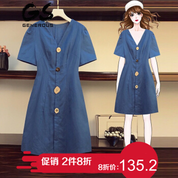 歌诺瑞丝大码女装胖mm连衣裙2020夏装新款文艺宽松显瘦休闲气质减龄韩版遮肚子V领中长款裙子 蓝色 XL 推荐120-140斤 |