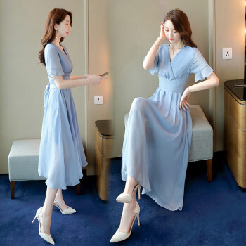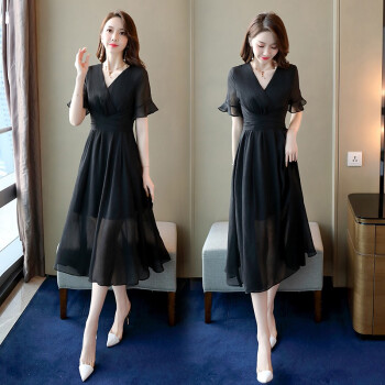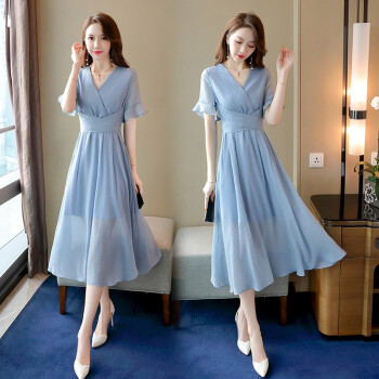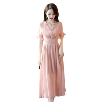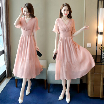 信和祥雪纺连衣裙女2020夏季流行新款简约V领通勤荷叶袖中长款纯色短袖夏天气质裙子 粉色 L |