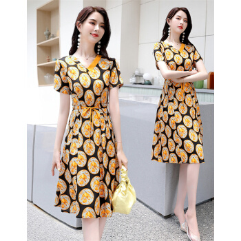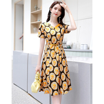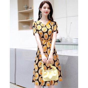 莺飞雪仿真丝连衣裙女2020夏季流行新款时尚条纹衬衫裙短袖夏天气质雪纺裙子 黑底黄 M(建议80-100斤) |