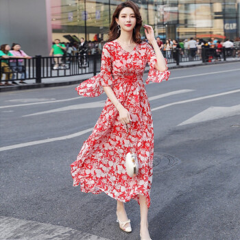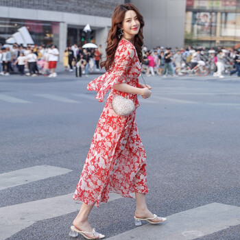 若玲珑网红碎花雪纺连衣裙2020新款夏收腰显瘦荷叶边气质小清新甜美超仙长裙 红花 M(建议90-105斤) |