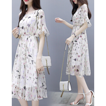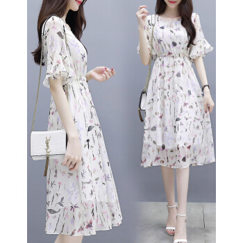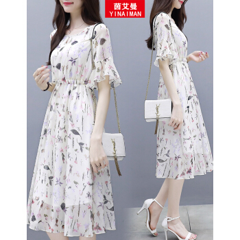茵艾曼连衣裙女雪纺2020夏季新款女装韩版小个子时尚潮港味印花短袖中长款裙子 A386图片色 M《100-110斤》 |